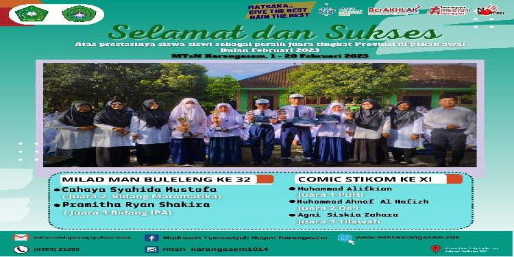 [Prestasi] Selamat & Sukses kepada siswa dan siswi perwakilah MTsN Karangasem dalam berbagai ajang lomba akademik dan non akademik cabang lomba tingkat Provinsi di pekan awal bulan Februari 2023,