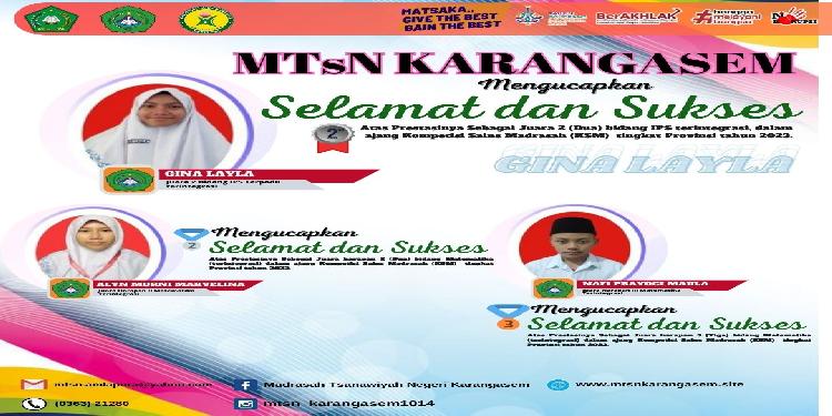 Selamat dan sukses kepada siswa siswi yang berhasil memperoleh hasil yang Alhamdulillah membanggakan seluruh keluarga besar MTsN Karangasem, dalam Ajang KSM Provinsi, yakni : atas nama ananda: